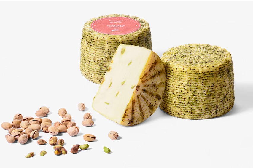 Formaggio con una crosta molto sottile, di colore bianco o giallo paglierino, di breve stagionatura, aromatizzato ai pistacchi.